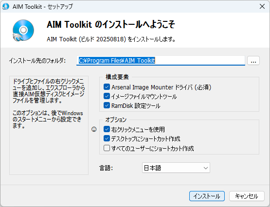 AIM Toolkit は、 RAM ディスクの作成とイメージファイルのマウントができるツールキットです。