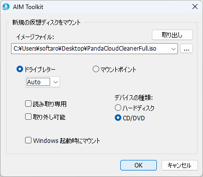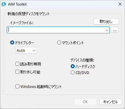 AIM Toolkit は、任意のサイズの RAM ディスクを作成したり、さまざまな形式のイメージファイルをマウントすることができる Windows 向けのフリーソフトです。