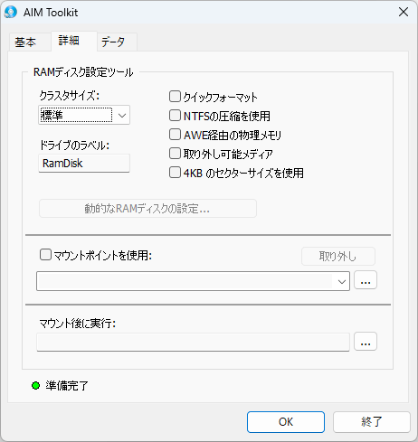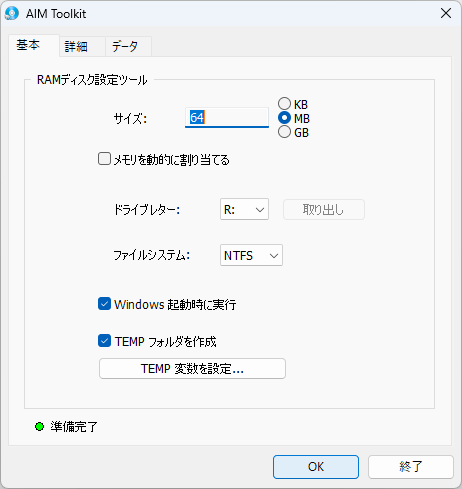AIM Toolkit では、NTFS / FAT / FAT32 / exFAT のファイルシステムに対応しており、メモリを動的に割り当てたり、Windows 起動時に RAM ディスクを作成するように設定することもできます。