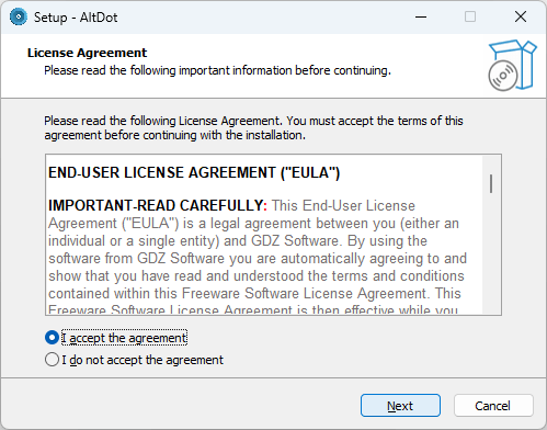• ライセンスが表示されます。「I accept the agreement」を選択して[Next]をクリックします。