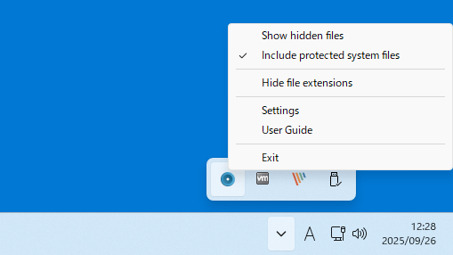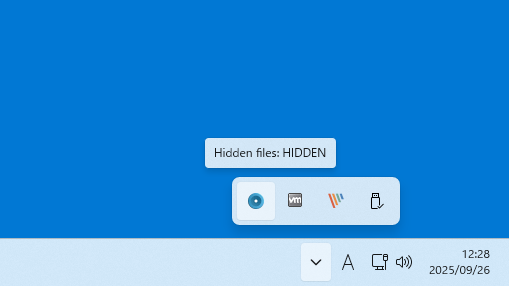 トレイアイコンから、隠しファイル/フォルダの表示/非表示、ファイル拡張子の表示/非表示を切り替えることができる、Windows 向けのフリーソフト。