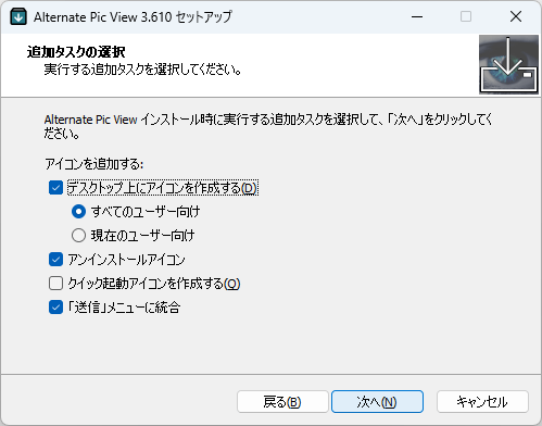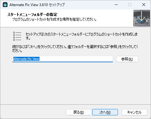 - スタートメニューに作成するショートカットの設定を確認して[次へ]をクリックします。