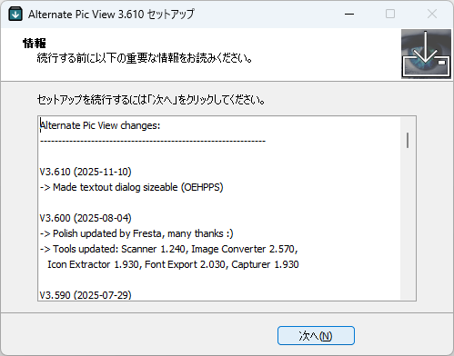 - ソフトウェアの情報が表示されます。[次へ]をクリックします。