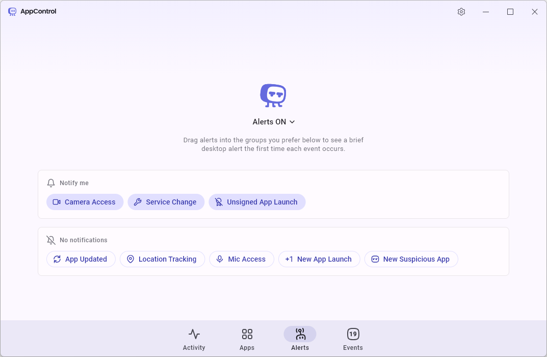 - 新しいアプリや異常なアプリの実行が開始されたときにリアルタイムの警告を表示。