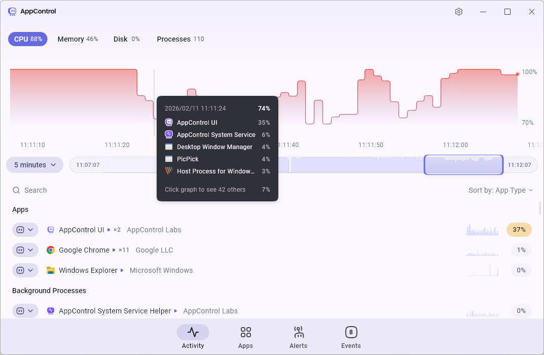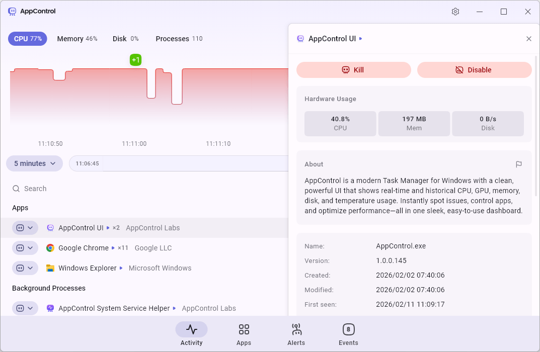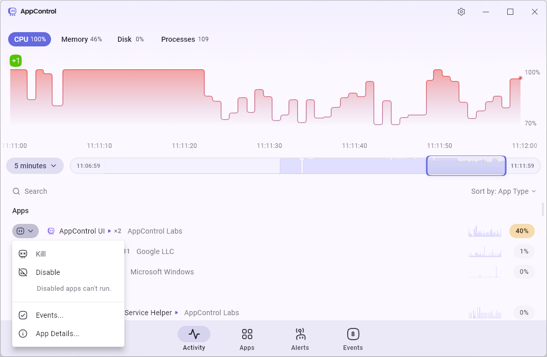 AppControl は、リソース使用状況のリアルタイムを監視し、履歴を追跡できる Windows 向けの強力なタスクマネージャです。