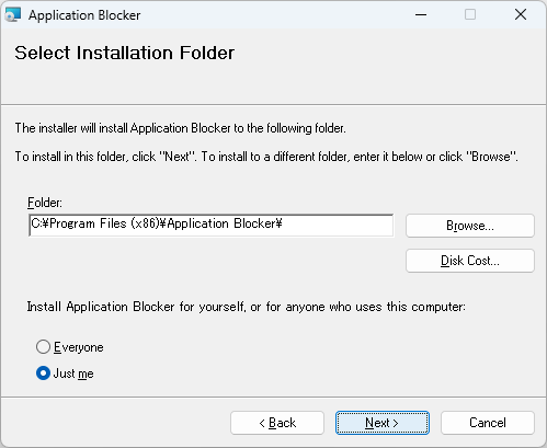 - インストール先とインストールするユーザーを確認して[Next]をクリックします。