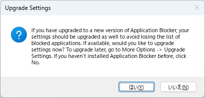- アプリケーションブロッカーを新しいバージョンにアップグレードした場合は、ブロックされたアプリケーションのリストが失われないように、設定もアップグレードする必要があります。アップグレードする場合は[はい]をクリックします。