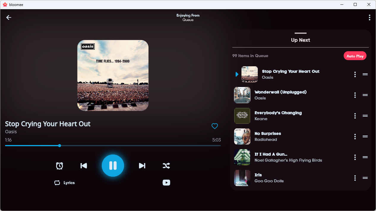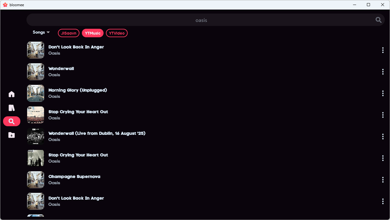 Bloomee では、局の再生のほかに、お気に入り機能、時間同期の歌詞サポート、音楽のダウンロードなどの機能があります。