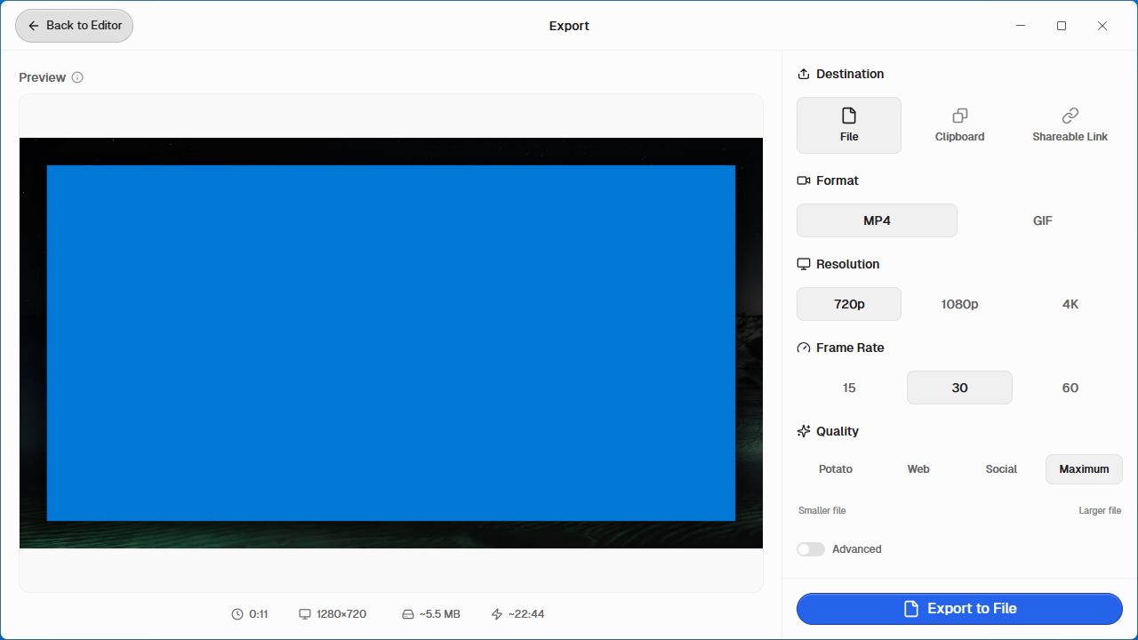 - 録画が完了すると、編集画面が開きます。ビデオを保存するには[Export]ボタンをクリックします。