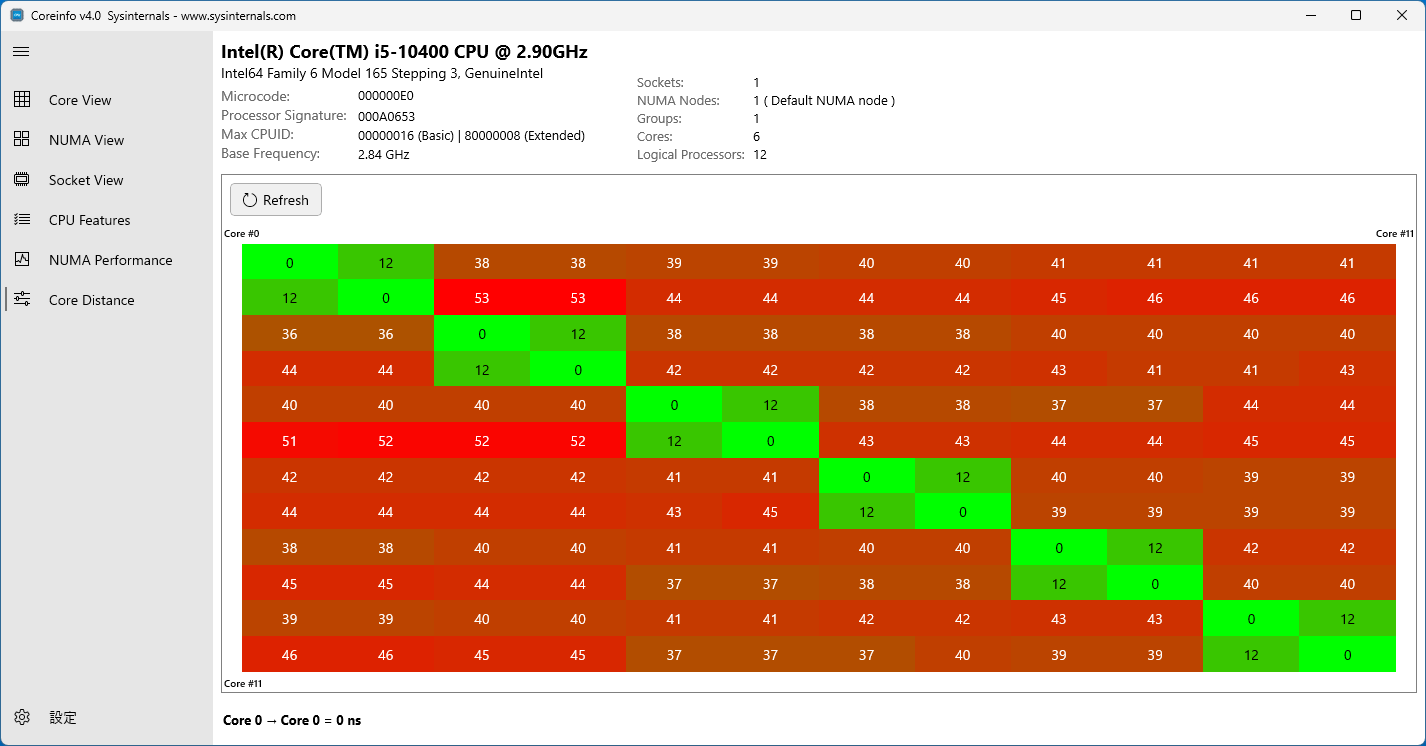 - 「Core Distance」には、個々の CPU コア間の通信コストの詳細なヒート マップが表示され、コアからコアへの待機時間と通信効率に関する分析情報が提供されます。