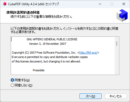 - 使用許諾契約書が表示されます。「同意する」を選択して[次へ]をクリックします。