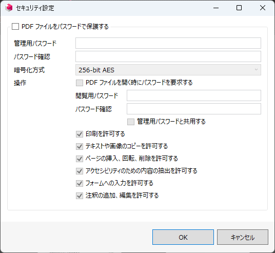 - PDF のセキュリティ設定(パスワード保護や権限の編集など)。