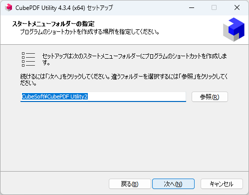 - スタートメニューに作成するショートカットの設定を確認して[次へ]をクリックします。
