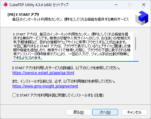 - サードパーティ製品のインストールが勧められます。インストールしたくない場合はチェックをしないでこのまま[次へ]をクリックします。