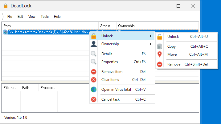 DeadLock を使用すると、システムや他のアプリケーションによってロックされたファイルやフォルダのロックを解除できるので、使用中のファイルを削除または移動、コピーしたい場合に便利です。