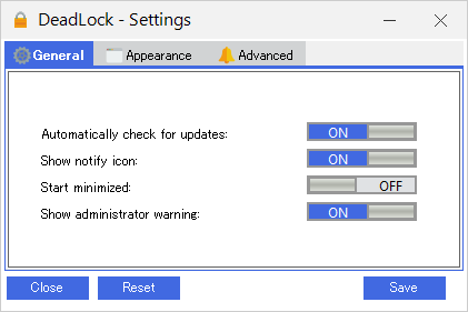 DeadLock の設定画面にアクセスすると、アプリの自動更新を有効/無効にしたり、アプリのテーマを変更したり、Windows エクスプローラに統合することができます。