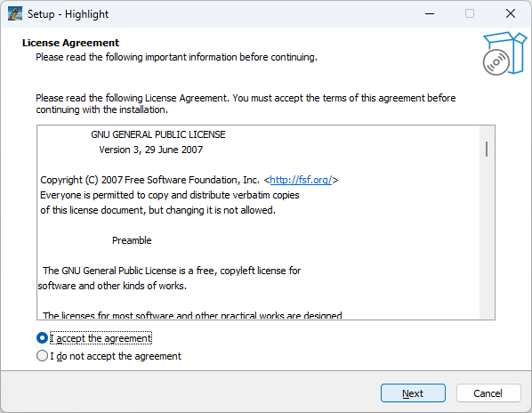 - ライセンスが表示されます。「I accept the agreement」を選択して[Next]をクリックします。