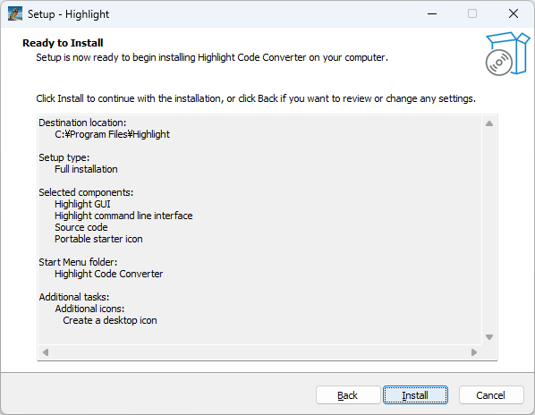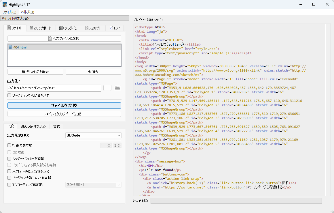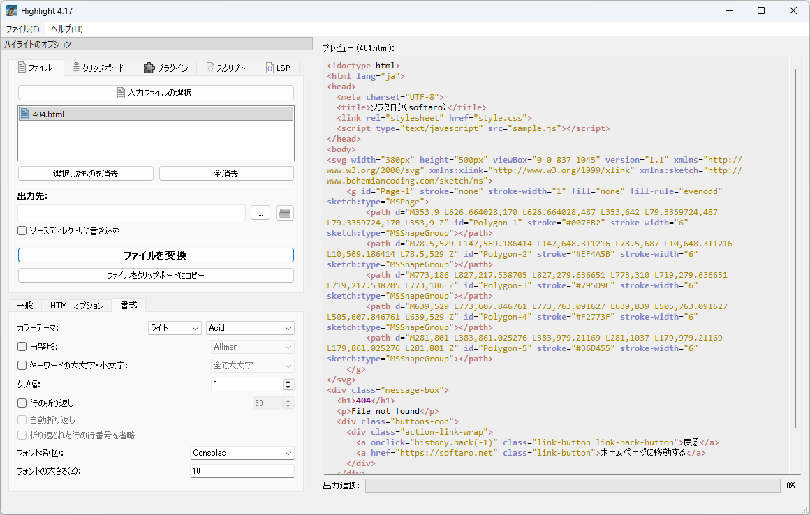 Highlight は、ソースコードを HTML、XHTML、RTF、LaTeX、TeX、SVG、ODT、BBCode、ANSI ESC、XTerm 256 ESC、Truecolor ESC などの形式に変換することができる、Windows 向けのフリーのソースコードコンバータです。