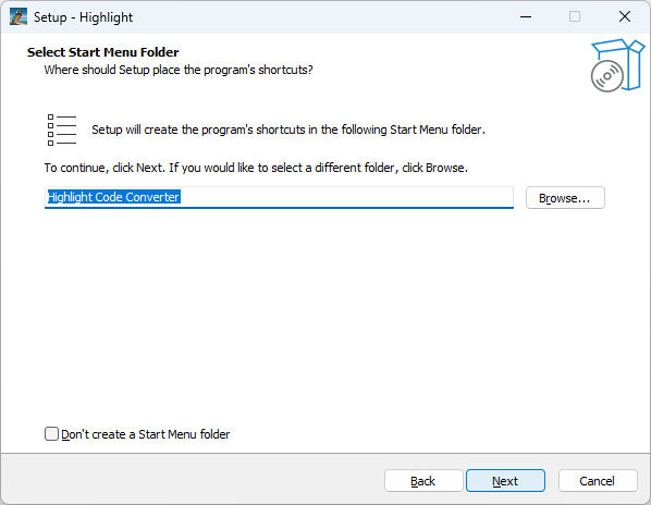- スタートメニューに作成するショートカットの設定を確認して[Next]をクリックします。