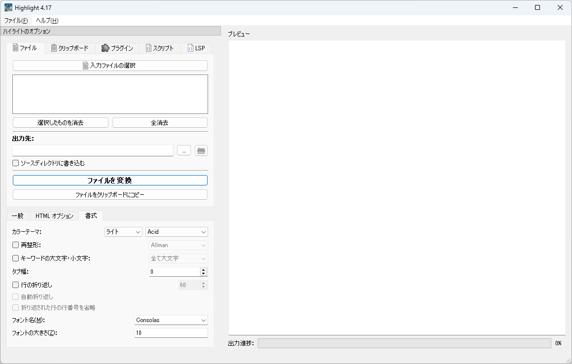Highlight では、カラーテーマ、再フォーマットモード、キーワードの大文字と小文字の区別、行の折り返し、フォント名、サイズなど、テキストの書式設定に加え、行番号の追加、ヘッダーとフッターの省略、エンコード方式の選択、プラグインの追加も可能です。