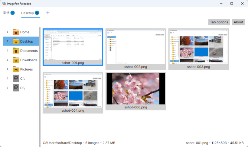 - 左側のツリーからフォルダを選択すると、フォルダ内の画像がサムネイル表示されます。