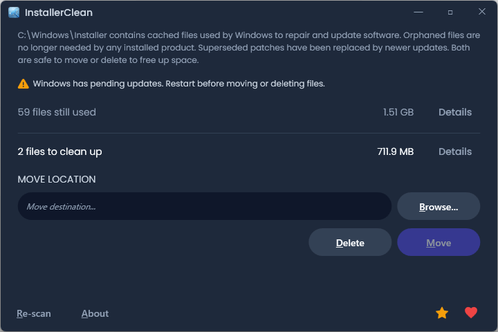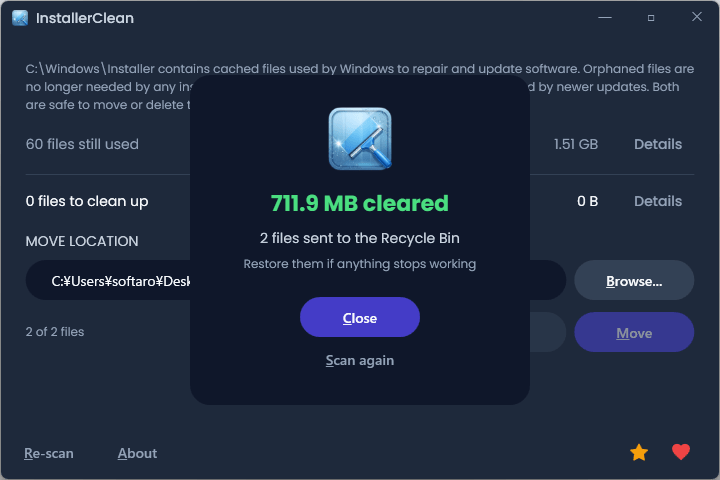 InstallerClean は、孤立した Windows インストーラーファイルを安全にクリーンアップし、ディスク容量を解放するオープンソースツールです。