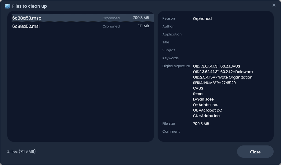 InstallerClean は、Windows の隠しフォルダである C:\Windows\Installer をスキャンし、Microsoft Office、Adobe Acrobat、Visual Studio、またはその他の Windows ベースのアプリケーションの使われていない孤立した不要ファイルを見つけます。