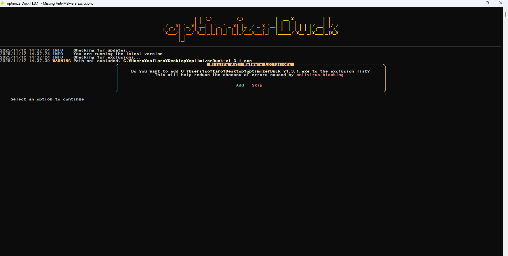 - はじめに、optimizerDuck をウイルス対策の除外リストに追加するかどうかを尋ねられます。追加する場合は「A」追加しない場合は「S」キーを押します。
