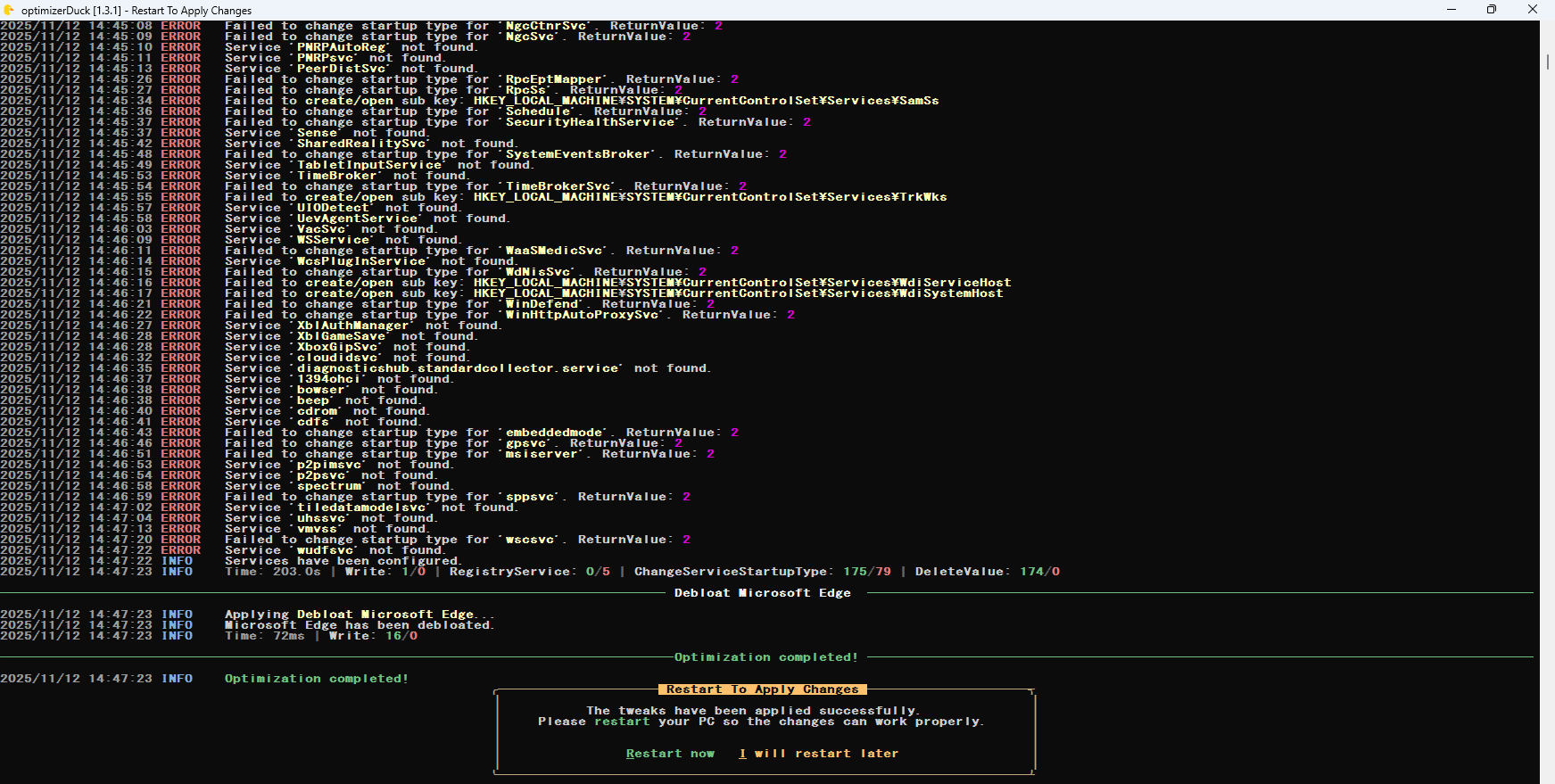 optimizerDuck を使用すると、バックグラウンドアプリを無効化して RAM と CPU のリソースを解放したり、フォアグラウンドアプリの優先度を調整して応答性を向上させたり、テレメトリサービスとタスクを無効にしたり、Cortana と Search AI、Copilot を無効にしたり、ユーザー アカウント制御 (UAC) を無効にしたり、休止状態を無効にしたり、USB 省電力や電源プランの省電力を無効にしたり、タスクバーを簡素化して整理したり、プリインストールアプリ(ブロートウェア)を削除することができます。