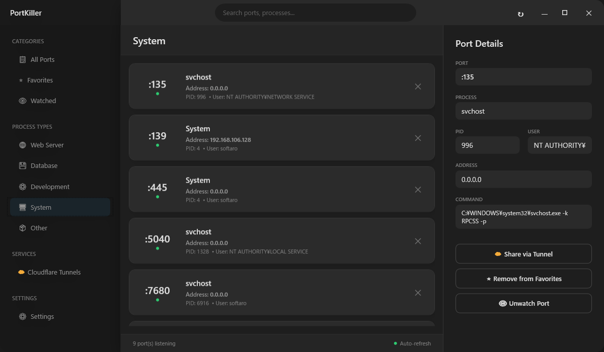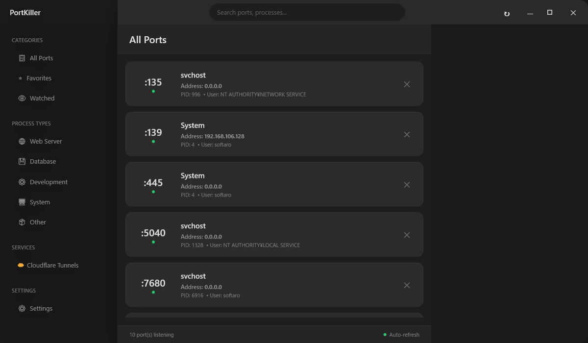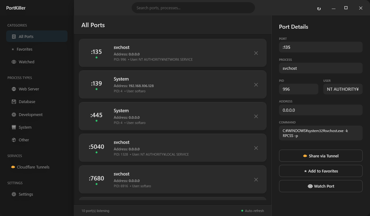 ポートの監視、Kubernetes ポート転送の管理、Cloudflare トンネルの統合、ワンクリックでのプロセスの強制終了などを行うことができる、Windows および macOS 向けのポート管理ツール。