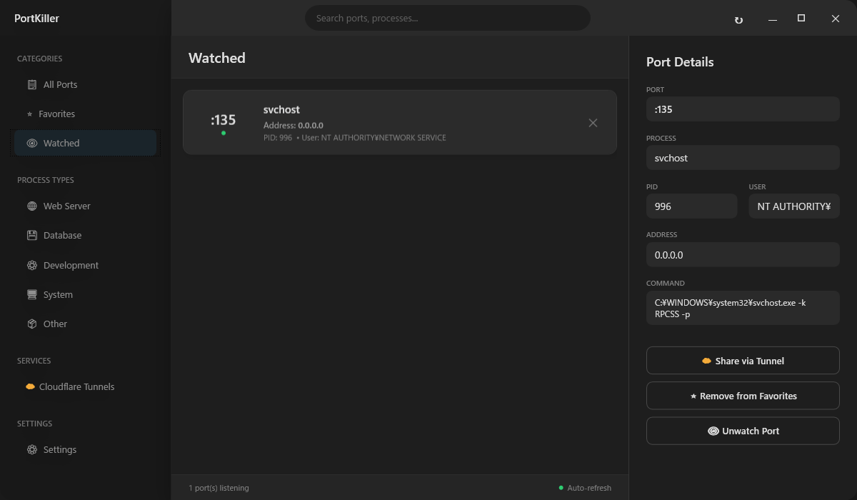 PortKiller は、コンピュータ上のポート接続を監視し、Cloudflare Tunnel を介して共有するためのシンプルな手段を提供したり、kubectl ポートフォワードセッションを作成し、ローカルワークステーションを Kubernetes クラスター上で実行されているリソースに接続することもできるアプリケーションです。