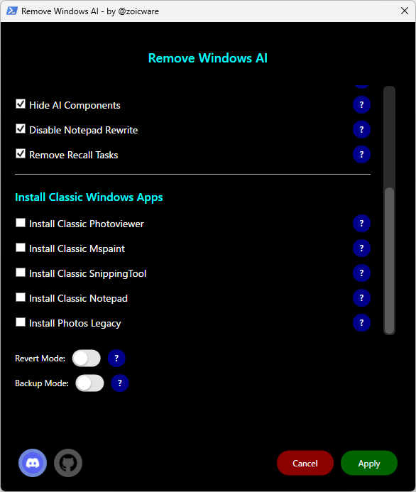 Remove Windows AI は、Windows から不要な AI 機能を削除することができる便利なアプリケーションです。アプリを使用するにあたり、変更前の Windows に戻す予定がある場合は、「バックアップモード」と「復元 (Revert) モード」を有効にすることを忘れないでください。