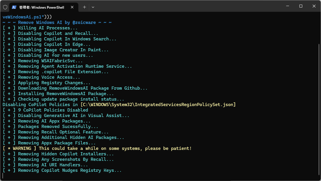 - Nonremovable パッケージと WindowsWorkload を含むすべての AI appx パッケージを削除します