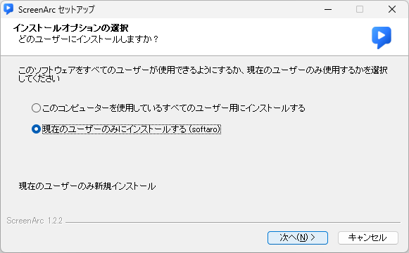 • インストールするユーザーを選択して[次へ]をクリックします。