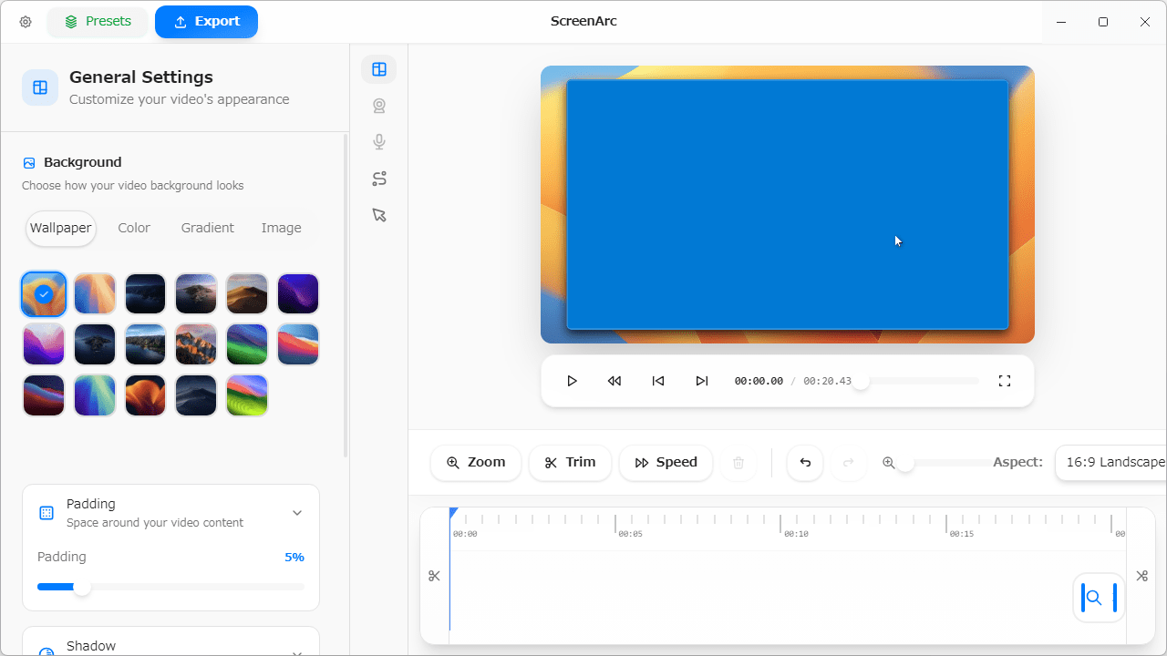 ScreenArc の編集機能を使用すると、動画の一部をトリミングしたり、速度を調整したり、ズームやパンを追加したり、背景を変更したり、アスペクト比を変更したり、ウェブカメラのオーバーレイを重ねたりすることができます。
