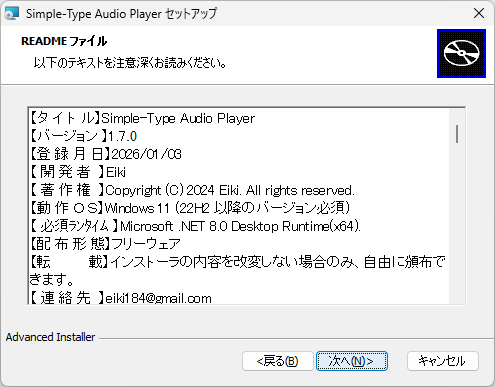 - ソフトウェアの情報が表示されます。[次へ]をクリックします。