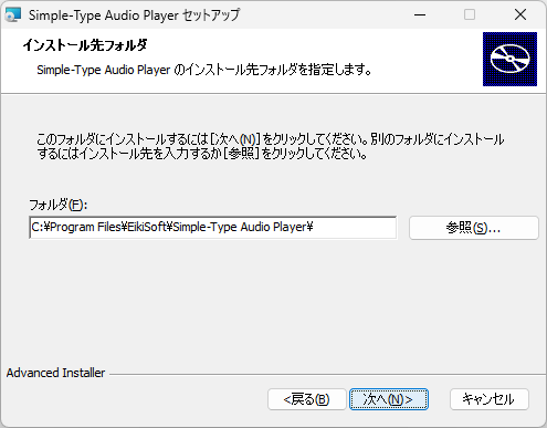 - インストール先を確認して[次へ]をクリックします。