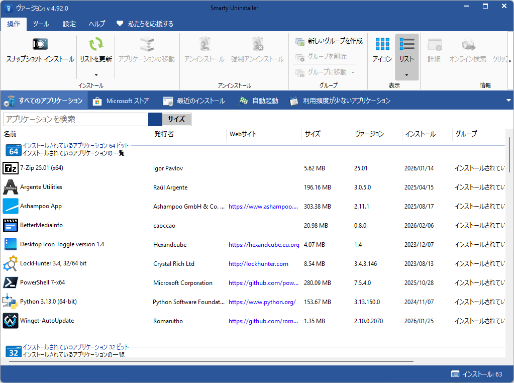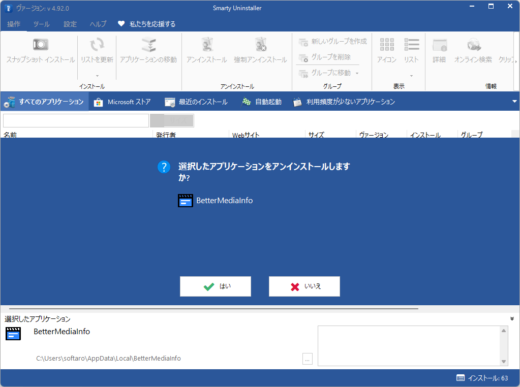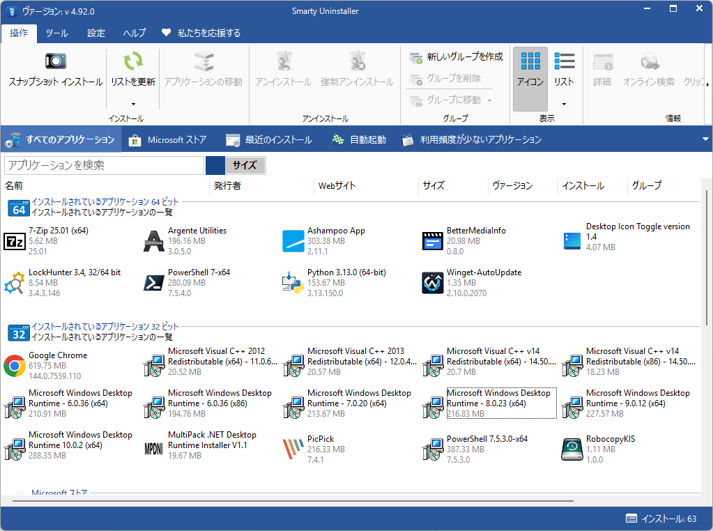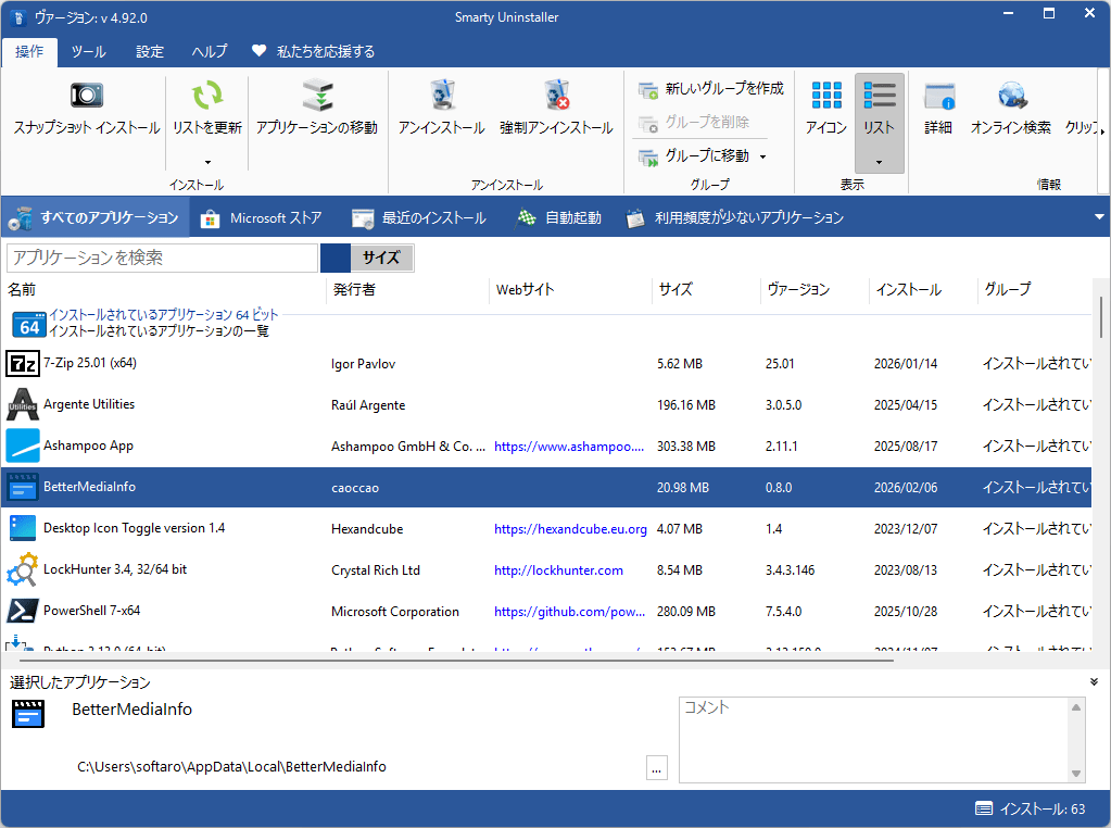 - アプリケーションの詳細情報 (名前、バージョン、サイズ、インストール場所など)