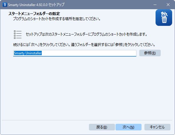 - スタートメニューに作成するショートカットの設定を確認して[次へ]をクリックします。