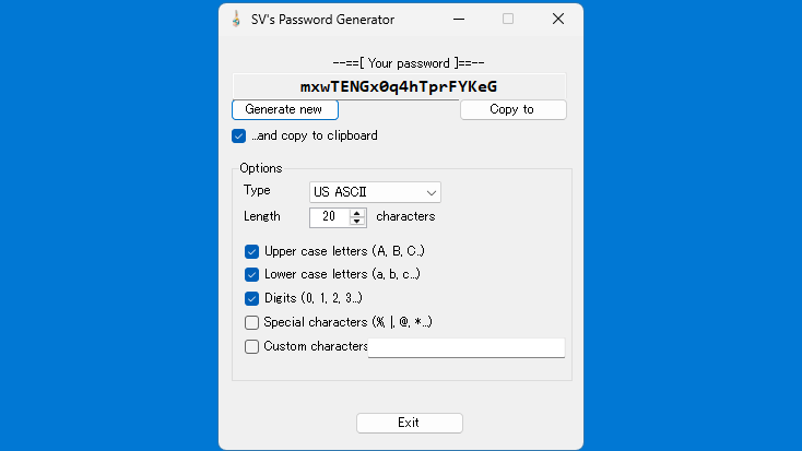 SV’s Password Generator は、効率的にユーザーの求める強力なパスワードを作成し、クリップボードにコピーすることができる使いやすいパスワードジェネレータです。