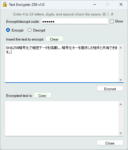 テキストを暗号化することができる、Windows 向けのフリーソフト。パスワード、アイデア、メッセージなどの任意のテキストを強力な SHA-256 暗号化アルゴリズムを使用して暗号化します。