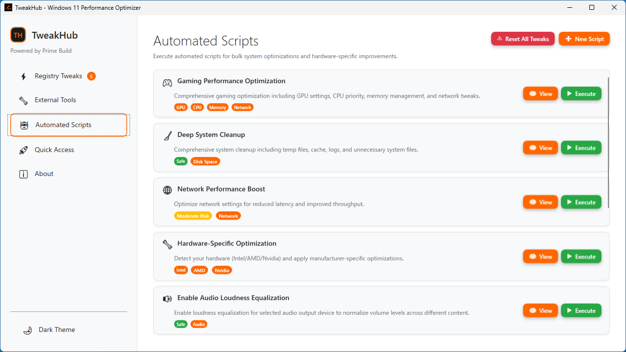 TweakHub の主なセクションは「Registry Twewaks」と「Automated Script」で、前者では、CPU の最適化、メモリの最適化、ネットワーク最適化、ゲームパフォーマンスの最適化、システム応答性の向上、ストレージとファイルシステムのチューニング、バックグラウンドプロセスの最適化などを行うことができます。後者では、ゲームパフォーマンス最適化、システムクリーンアップ、システム修復、ハードウェアの最適化などを実行できます。