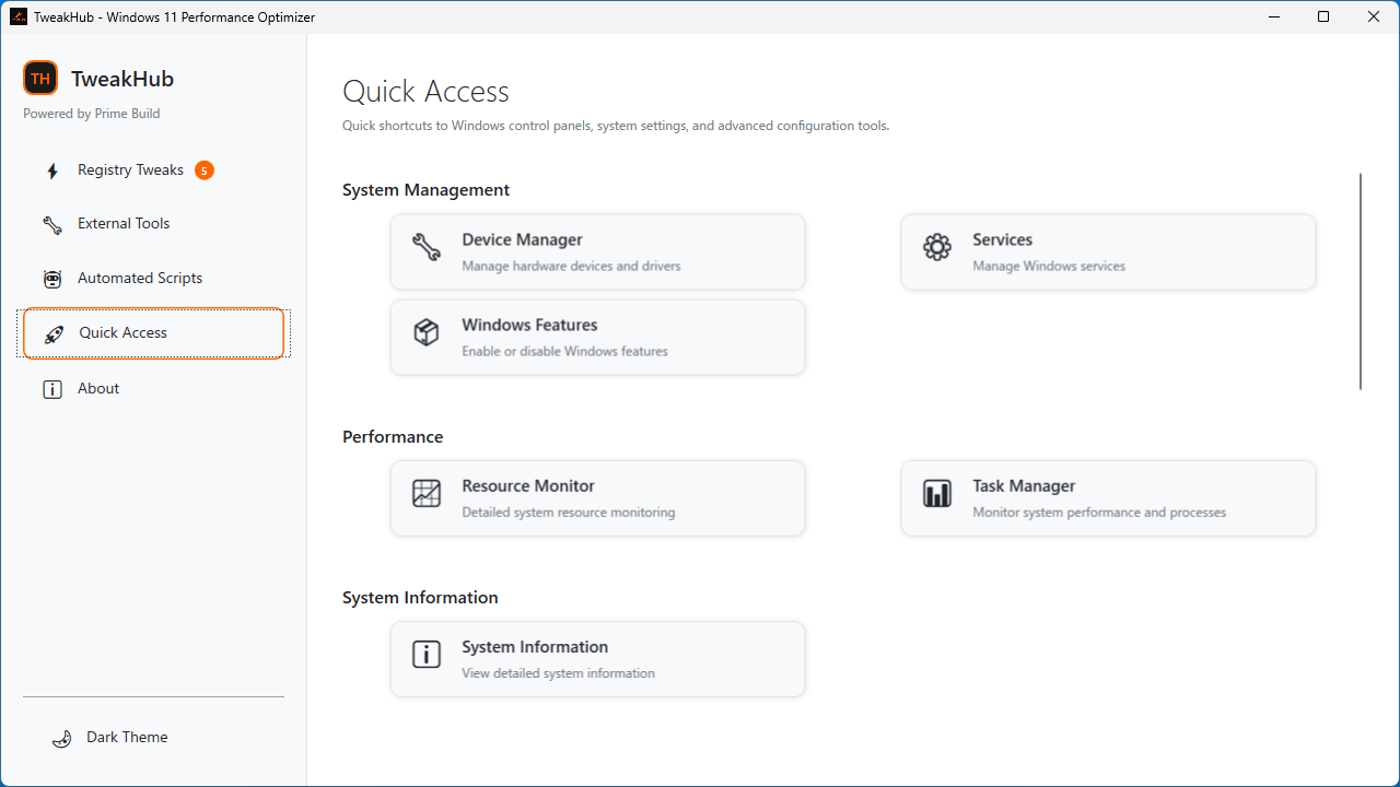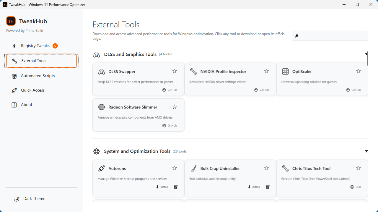 TweakHub を使用すると、一か所に集められた複数の最適化ツールを使用することにより、PC のメンテナンスとチューニングを効率的に行うことができます。