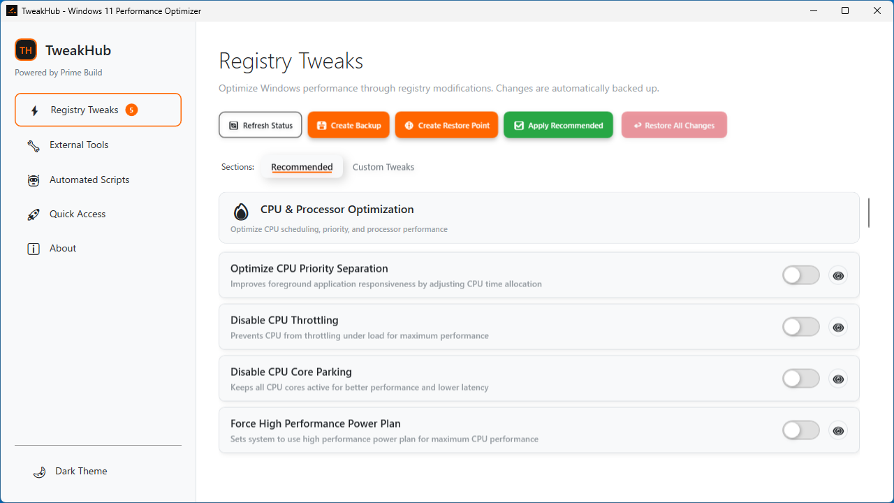TweakHub は、最適な最適化ツールと高度な調整機能を提供する PC 最適化アプリです。インターフェースは英語のため、設定内容を理解できる知識が必要になります。このアプリには、レジストリのバックアップおよび復元ポイントの作成機能があるので、最適化実行前にバックアップを作成しておくことをおすすめします。
