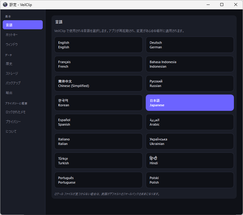 VeilClip は、クリップボードの履歴全体をキャプチャし、ローカルの SQLite データベースに保存します。アカウントも不要、テレメトリも不要、インターネット接続も一切必要ありません。