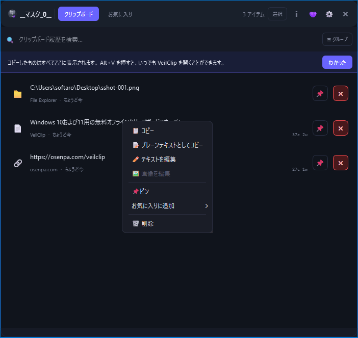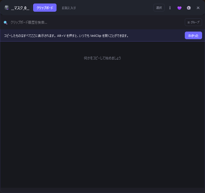 • Alt + V」キーを押すと、VeilClip のメイン画面を開くことができます。