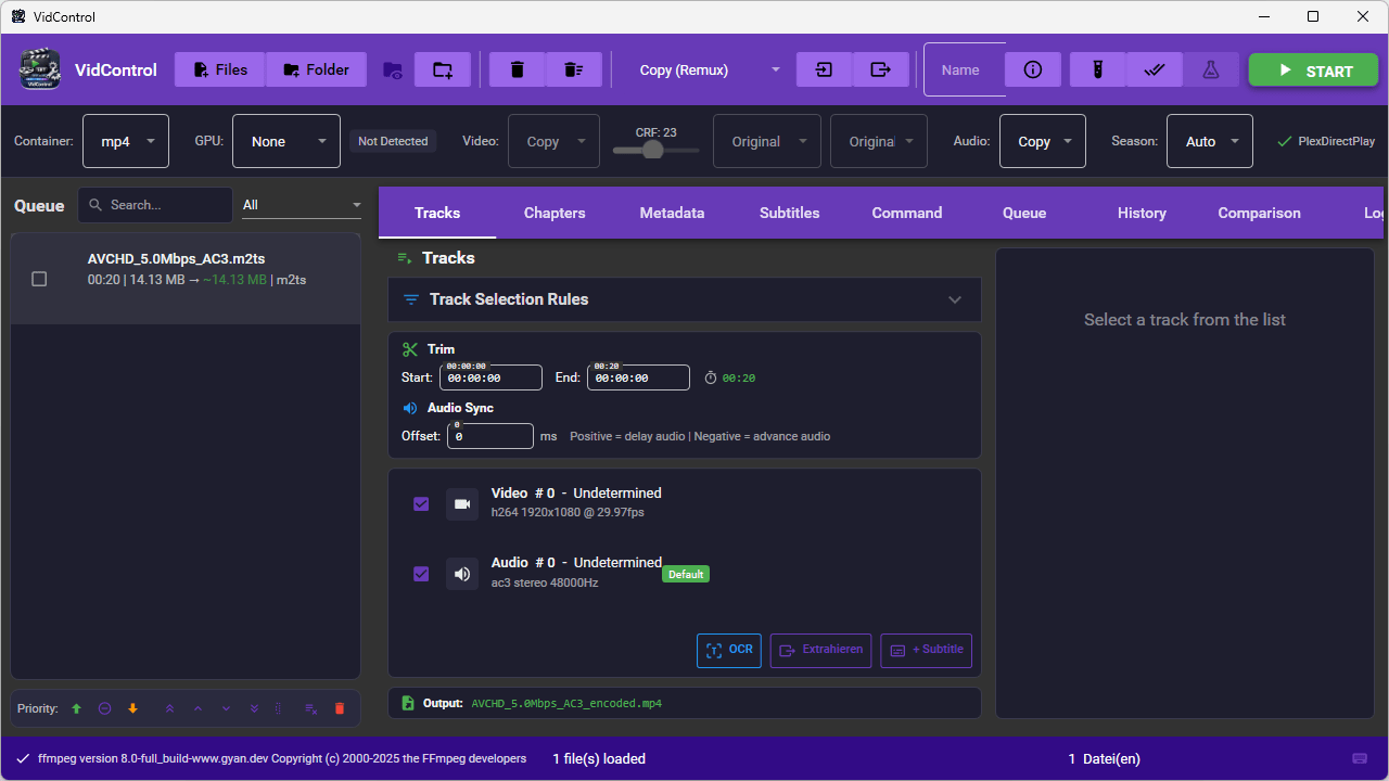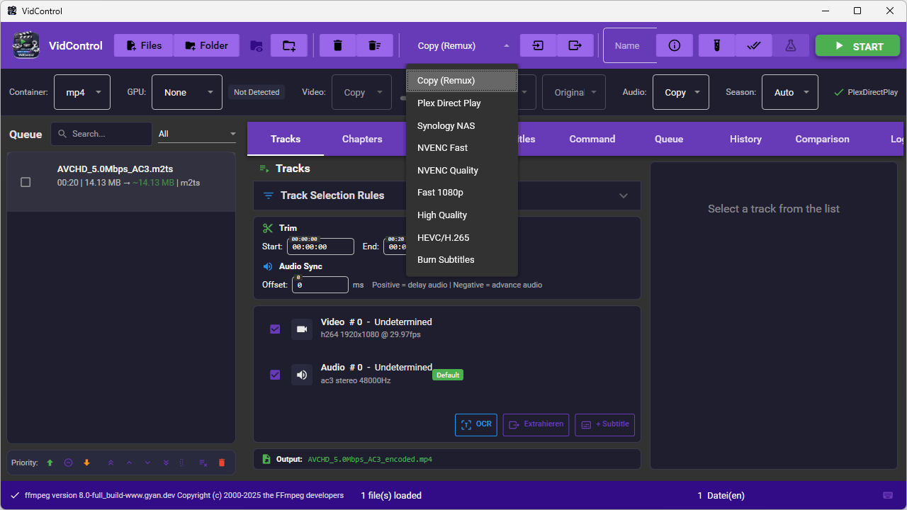 VidControl では、バッチキュー機能があるので、複数のファイルをキューに入れて、自動的に次々にファイルを処理できます。また、CRF 値からオーディオ設定まで、すばやく設定できる定義済みのプリセットが用意されているので、初心者でもかんたんにビデオをエンコードできます。