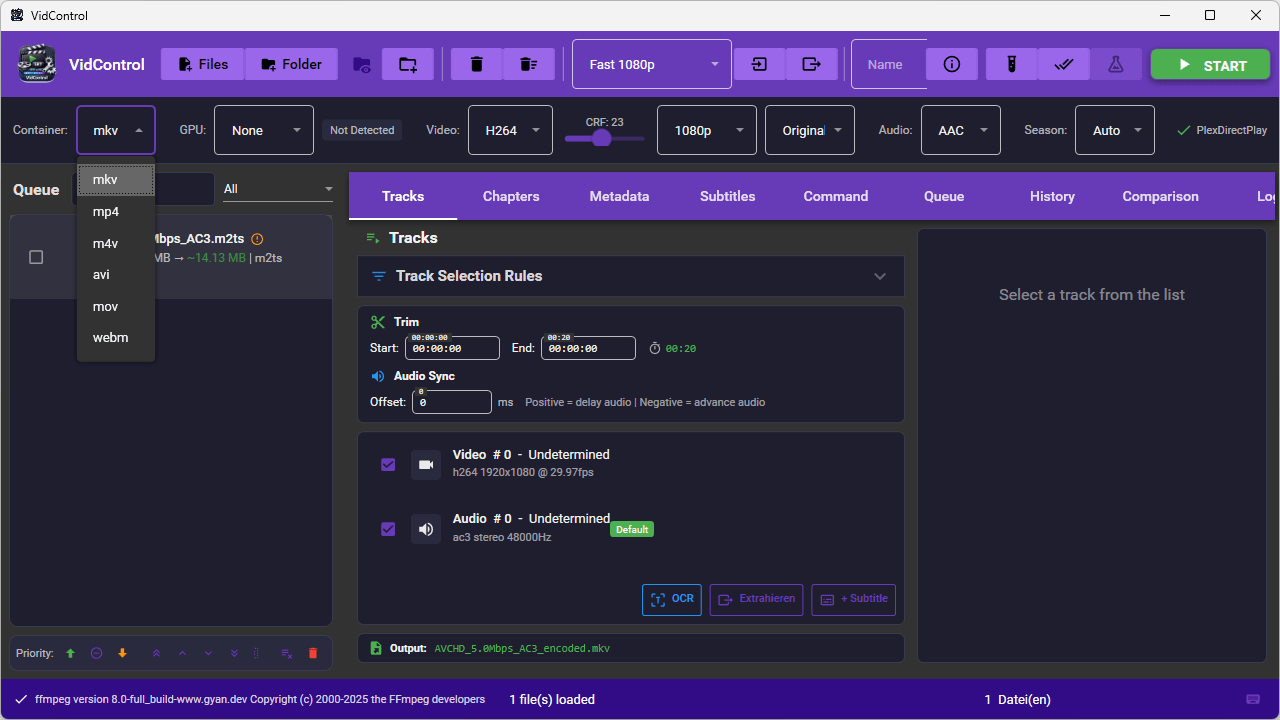 VidControl を使用すると、GPU エンコードによる最高速度を実現することが可能で、MKV、MP4、AVI、MOV、WebM、WMV、TS、M2TS などの一般的なビデオ形式をエンコードできます。