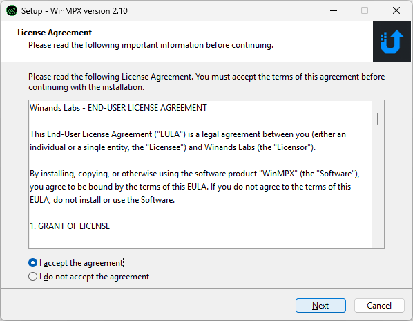 - ライセンスが表示されます。「I accept the agreement」を選択して[Next]をクリックします。
