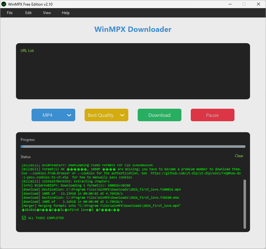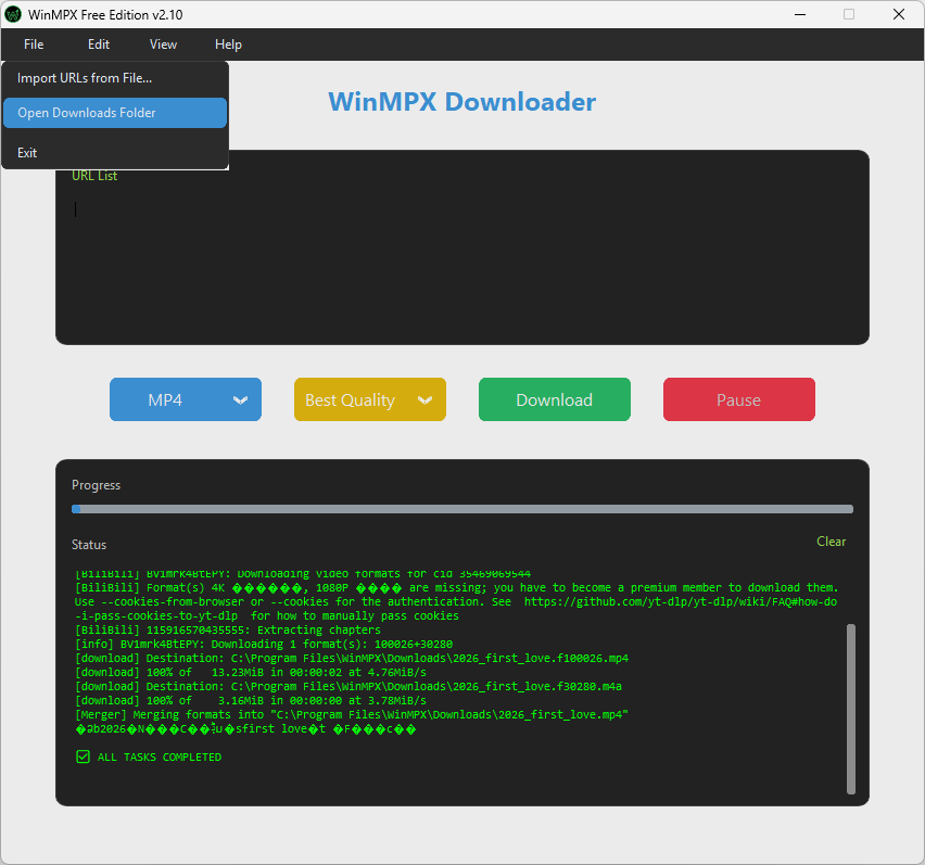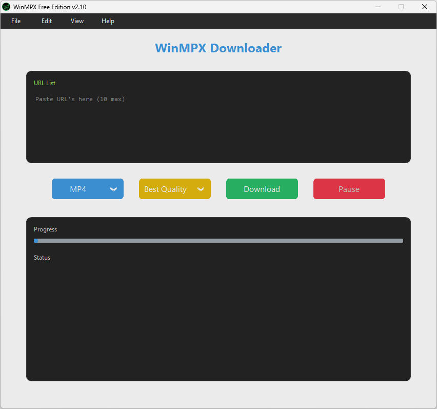 WinMPX では、最大 10 個の URL を入力して一括ダウンロードすることが可能で、URL が書かれたテキストファイルのインポートにも対応しています。